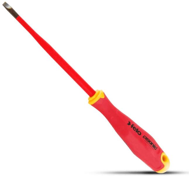 FELO vékonyított csavarhúzó szigetelt ERGONIC markolattal. Az egyetlen markolat, melynek a belsejében lévő zselés cella alkalmazkodik a felhasználó tenyeréhez, a maximális nyomaték kifejtése mellett, egyedülállóan kényelmessé teszi a munkavégzést. A csavarhúzó 1000 voltig használható. Minden darab 10.000 volttal tesztelt, megfelel az EN60900 szabványnak Mérete: 3,5x0,5x1