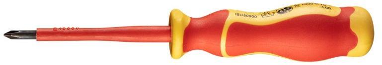 NEO PH kereszt csavarhúzó, 1000 V. A szerszám max. 1000 V feszültség alatti használatra minősített. A csavarhúzó hegye erős S2 acélból készül. A csavarhúzó hegye mágneses. A speciális gallérral ellátott nyél ergonómikus alakja csökkenti a kéz terhelését munka közben. A bimateriál markolat nem csúszik ki a kézből, ellenálló vegyszerek, kenőolajok és zsírok hatá