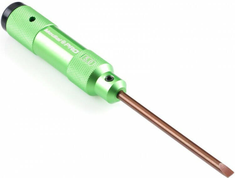 A kiváló minőségű 5,0 mm-es Medial Pro laposfejű csavarhúzó 97 mm hosszú alumínium nyéllel, 21 mm átmérőjű gumi támasztékkal és 83 mm hosszú szárral rendelkezik. Tetszetős csomagolás műanyag dobozban.