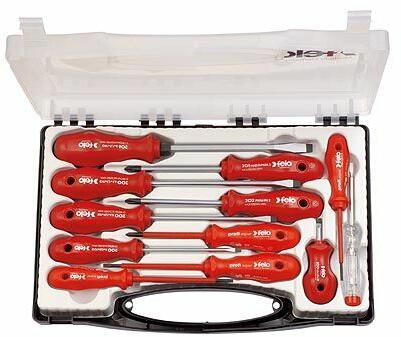 FELO csavarhúzó készlet, különösen nagy igénybevételre tervezett, egy komponensű markolattal, tároló dobozban. A markolatban található furat segítségével könnyen tárolható a szerszám és egy másik FELO csavarhúzó segítségével extra nyomaték érhető el. Tartalma: 4,0x100, 5,5x25, 5,5x125, 6,5x150, PZ2x100, PH2x100, 8,0x150 gépi, 2,5x75 szigetelt, 3,5x100 szigetelt, 4,0x