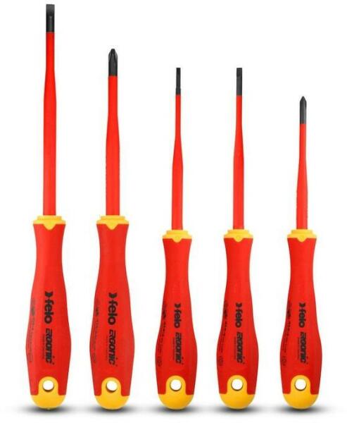FELO vékonyított csavarhúzó készlet szigetelt ERGONIC markolattal. Az egyetlen markolat, melynek a belsejében lévő zselés cella alkalmazkodik a felhasználó tenyeréhez, a maximális nyomaték kifejtése mellett, egyedülállóan kényelmessé teszi a munkavégzést. A csavarhúzó 1000 voltig használható. Minden darab 10.000 volttal tesztelt, megfelel az EN60900 szabványnak Tartalma: