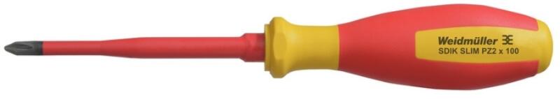 WEIDMÜLLER SDIK SLIM PZ2 X 100 VDE szerint szigetelt kereszthornyos csavarhúzó, Pozidriv típus, 2. méret, SlimLine (2749680000) Term ékinformáció: VDE-szig etelésű csavarhúzó készletek, max. 1000 V AC és 1500 V DC feszültség alatt álló alkatrészekhez, DIN EN 60900. IEC 900. Minden darab „GS Safety bevizsgálással. A vágókés edzett, magas minőségű króm-vanádium-molibd