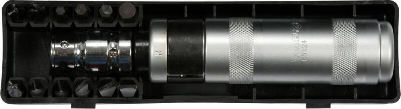 Ütvecsavarozzó 12 bittel toldóval. A bitek és a csavarhúzó robusztus, króm-vanádium acélból készült. Lapos, Phillips (PH), hatszögletű Szerszámtartó mérete: 5/16" (7,9 mm) Csavarhúzó hossza: 160 mm Toldás hossza: 35 mm Anyag: króm vanádium Felületkezelés: krómozott Mágnesezett Darabszám a készletben: 14