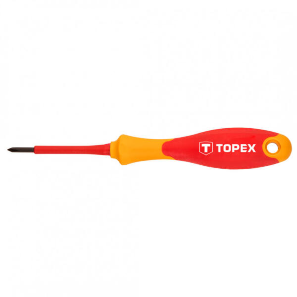 Tulajdonságok A TOPEX kereszt csavarhúzó 1000 V a legfeljebb 1000 V feszültség melletti munkákra szolgál Kiváló minőségű króm-molibdén acélból készül, szigetelt Az ergonómikus, csúszásmentes anyaggal bevont műanyag markolat biztosítja a kényelmet és a biztonságot a munkavégzés során A TOPEX márka ezermestereknek készül