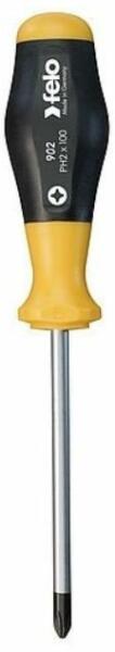 FELO PH csavarhúzó, különösen nagy igénybevételre tervezett, kétkomponensű markolattal. Alkalmazása: Philips típusú - általában lemez- és gipszkarton csavarokhoz. Méretei: PH2, penge hossza: 100 mm, penge átmérője: 6,0 mm, markolat hossza: 100 mm, markolat legnagyobb átmérője: 34 mm. Penge Anyaga: króm-molibdén-vanádium acél ötvözet. Felületkezelés: krómozott, a hegy