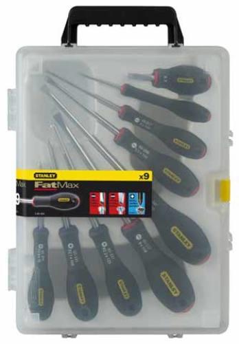 FatMax 9db-os csavarhózó készlet, tartó dobozban. (lapos, Pz) A nyél és a penge között extra erős összekötés. A penge kíváló minőségű acélból készült. Kényelmes csúszásgátló fogantyú. A fogantyúvégek simák a gyors csavarás érdekében. A nagy méreteknél erősített kivitel. Lapos: 5,5 x 100; 6,5 x 150; 8x150mm. Párhuzamos: 3 x 50; 4 x 100; 6,5x30mm. Pozidriv: 0x7