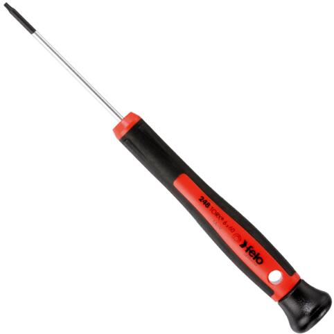 FELO Torx műszerész csavarhúzó, kétkomponensű csúszásmentes markolattal. A markolat végén elhelyezkedő szabadon forgó sapkának köszönhetően a súrlódás minimálisra csökken. A markolatban található furat segítségével könnyen tárolható a szerszám és egy másik FELO csavarhúzó segítségével extra nyomaték érhető el. Méretei: T5, penge hossza: 60 mm, penge átmér