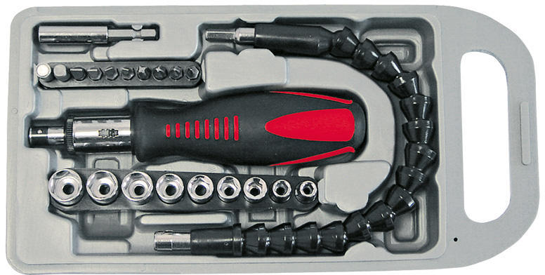 A készlet tartalma: - 1/4 " - es racsnis csavarhúzó hajtókar - flexibilis hosszabbító - 60 mm -es mágneses bittartó - Lapos bitfejek 1/4" - es: 3, 4, 5, 6 mm - Philips bitfejek: PH 0, 1, 2, 3 - 1/4 " - es adapter - 1/4 " - es csõkulcsok 5, 6, 7, 8, 9, 10, 11, 12, 13 mm Műanyag doboz kiszerelés