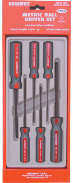 Nem szükséges merőlegesen a csavarfejekre helyezni, a szár gömbvége ±15° szögelfordulást tesz lehetővé, így nehezen megközelíthető csavarfejeknél is használható. Teljesen átedzett karbonacélból gyártva. Bordázott csavarhúzó nyél. Metrikus 6 darabos készlet tartalma: 1.5, 2, 2.5, 3, 4 és 5 mm.