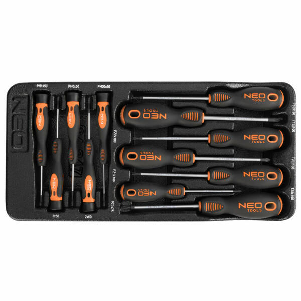 Neo csavarhúzó (ref. sz. 84-247) 12 csavarhúzó, a csúcsok kivételesen erős S2 acél ötvözetből készülnek. A csúcsok munkafeje hőmegmunkálva, melynek köszönhetően megfelelő a keménysége és hajlítószilárdsága. A csavarhúzók mágneses, szilárdított fejjel rendelkeznek. A profilozott hüvelykujj támasztós, háromszöges kialakítású markolat csökkenti a kéze megterh