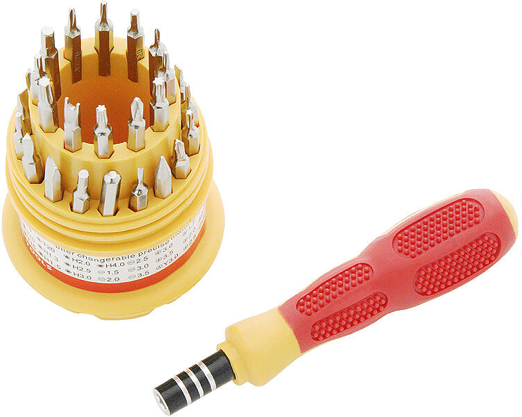 Szerszámkészlet (csavarhúzó + bitek) különböző szerviz- és szerelési munkákhoz. Rendkívül kényelmes fogantyú csúszásmentes markolattal és 31 bit csavarhúzóval és csavarkulccsal. Mindegyik "pite" alakban van csomagolva, így a bitek könnyen megtalálhatók és gyorsan cserélhetők. - Tartalmazza a következőket. - Nyél: csúszásmentes markolattal- A hegyek száma": 31 dara