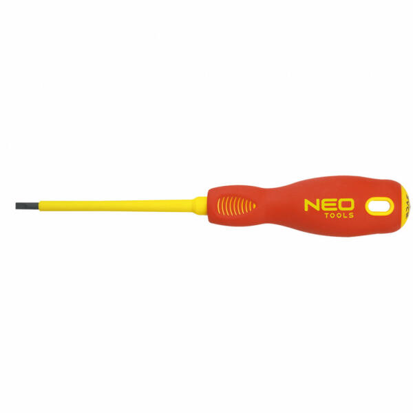Neo 1000 V lapos csavarhúzó. A szerszám max. 1000 V feszültség alatti használatra minősített. A csavarhúzó szára kivételesen ellenálló SVCM acélból készül. A csavarhúzó hegy hőkezelésnek lett alávetve, így megfelelő, 56 HRC keménységet és hajlítószilárdságot ért el. A csavarhúzó hegye mágneses. A markolat három élű hasáb alakja a kialakított hüvelyktámass