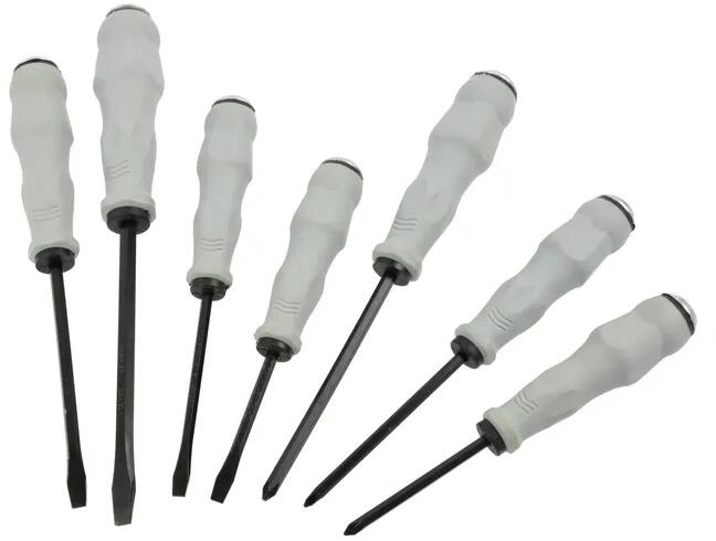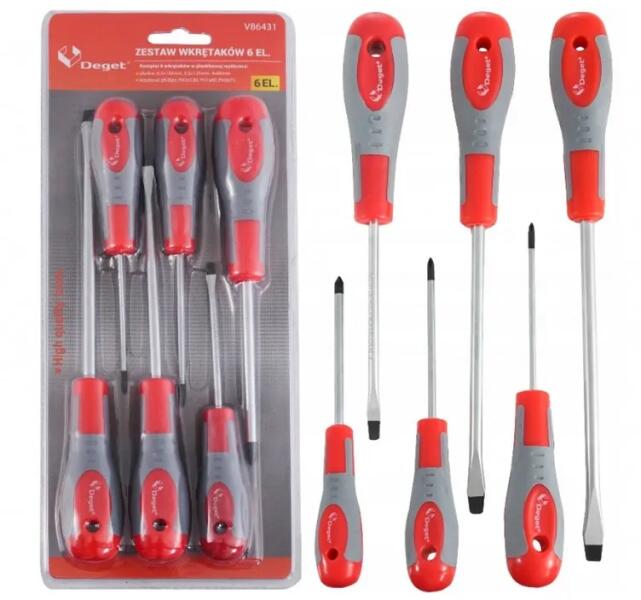 Csavarhúzó készlet króm vanádium acélból (CrV). Az ergonómikus fogantyú biztosítja a szerszám biztonságos fogását és a hatékony, pontos munkát. A készlet három lapos csavarhúzóból és három Phillips keresztcsavarhúzóból áll. A csavarhúzók méretét úgy választották meg, hogy megfeleljenek minden otthonban és műhelyben használt csavaroknak. A SZETT TARTALMA: lapos