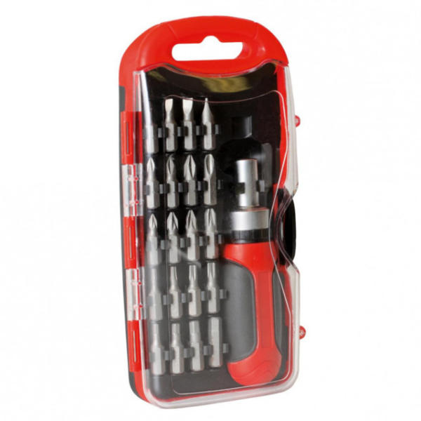 Home Csavarhúzókészlet, racsnis, 21 db-os, DE 101484 Használja a legprecízebb szerszámokat a munkájához. A DE 101484 egy 21 db-os racsnis csavarhúzó készlet. A 150 mm hosszú markolat mágneses, racsnis, irányváltós és rögzíthető kialakítással rendelkezik. A termékhez jár egy praktikus akasztható tárolódoboz, amelyben a következő bitek találhatóak meg BIT hegy méretek