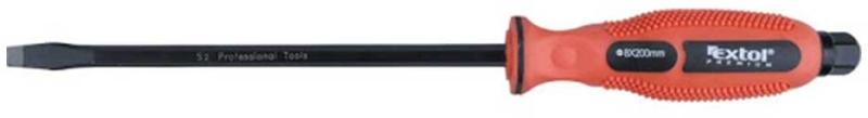 Extol Csavarhúzó, üthető, lapos 8×200mm, S2, mágneses Műszaki információk HRC 56-60-ra keményített mágneses hegy. speciális CrVMo acél. A teljes markolaton áthaladó hatoldalú szár végét kalapácshoz ütőfelületként, illetve kulcs segítségével meglazításhoz vagy meghúzáshoz is lehet használni.