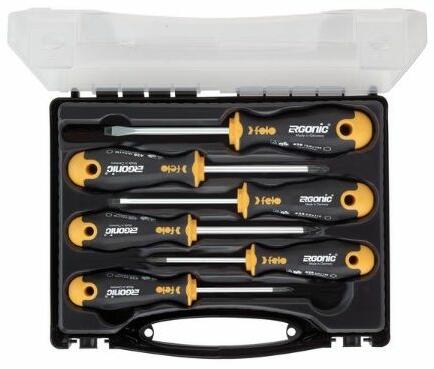 FELO csavarhúzó készlet ERGONIC markolattal. Az egyetlen markolat, melynek a belsejében lévő zselés cella alkalmazkodik a felhasználó tenyeréhez, a maximális nyomaték kifejtése mellett, egyedülállóan kényelmessé teszi a munkavégzést. Tartalma: 3,5x100, 4,0x100, 5,5x125, 6,5x150, PZ2x100, PH1x80, PH2x100 Alkalmazása: Philips - típusú (általában lemez-, metrikus-, inch-) csa
