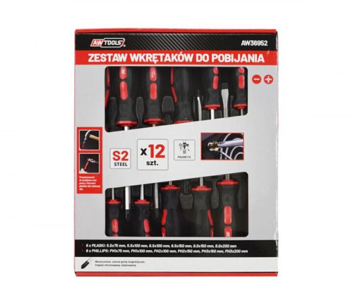 CSAVARHÚZÓ KÉSZLET ERGONOMIKUS NYÉLLEL, ÜTHETŐ FEJŰ, 12 RÉSZES, S2, AWTOOLS