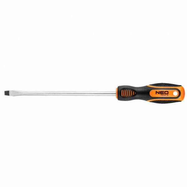 A Neo lapos csavarhúzó kiválóan alkalmas szerelési, barkácsolási munkákra. Hegye nagy ellenállóképességű, a szerszámnak hosszú élettartamot biztosító króm-vanádium acélból készült. A mágneses hegy megkönnyíti a szerszámmal végzett munkát Az ergonómikus, csúszásmentes anyaggal bevont műanyag markolat biztosítja a kényelmet és a biztonságot a munkavégzés sorá