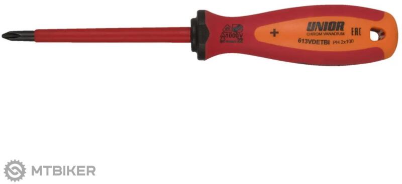 Unior PH3 szigetelt Phillips csavarhúzó ergonomikusan kialakított fogantyúval és akasztónyílással. A csavarhúzó kovácsolt, edzett króm-vanádium acélból készül ISO 8764-1,2 és EN IEC 60900 szerint gyártva. Penge hossza 150 mm, teljes hossza 270 mm, súlya 104 g.