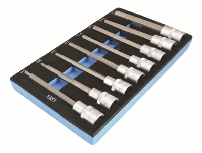 Habszivacs betét - imbusz H2-H10 hosszított 9dbHatszögű dugókulcsok 40 mm-es hosszal és 3/8" négyzetes szerszámrögzítéssel habszivacs betétben, ami biztosítja a kulcsok helyes elrendezését és rendben tartását a szerszámoskocsiban. A készlet 9 darab dugókulcsot tartalmaz: H2, H3, H4, H5, H5.5, H6, H7, H8 és H10. SATRA 4007 és ASTA3607B szerszámoskocsikhoz ajánlott.