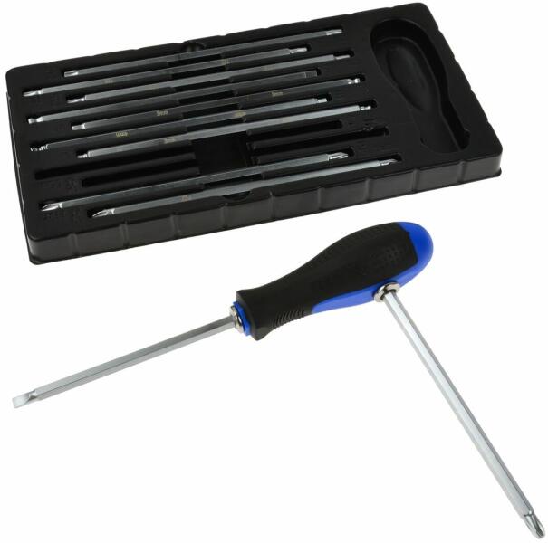 A termék leírása: Csavarhúzó cserélhető bitekkel 22in1. Tartalmaz 11 kétoldalas bitet különféle feladatokhoz. Gumírozott, csúszásmentes fogantyú. Penge hossza 175/115 mm. A készlet tartalma: Philips kereszt: # 1, # 2, # 3 Pozidrive kereszt: # 1, # 2 lapos: 4, 5,5, 6,5 mm hatlapú kulcsok: H3, H4, H5, H6 golyós csavarok: H3, H4, H5, H6 torx: T10, T15, T20, T25, T30, T35