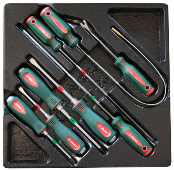HANS csavarhúzó készlet SL/PH 8 részes TT-28U fiókmodul Cr-V az iSzerszámnál. Professzionális, ipari minőségű HANS csavarhúzó készlet SL/PH mágneses/üthető 8 részes TT-28U fiókmodul Cr-V. Magasan ötvözött, foszfátozott, kopásálló pengehegy. Ergonomikus kialakítású, kémiailag semleges, kétkomponensű TPR markolat. Anyaga: Króm-vanádium DURA (Cr-V). Mágneses felszed