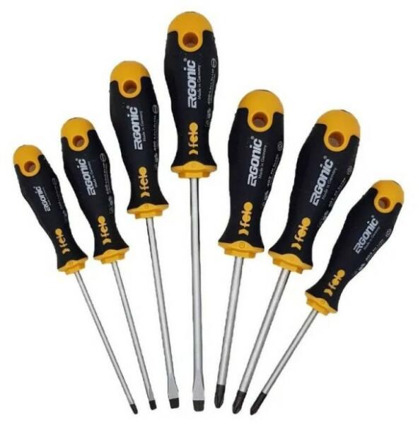 FELO csavarhúzó készlet ERGONIC markolattal. Az egyetlen markolat, melynek a belsejében lévő zselés cella alkalmazkodik a felhasználó tenyeréhez, a maximális nyomaték kifejtése mellett, egyedülállóan kényelmessé teszi a munkavégzést. Tartalma: 3,5x100, 4,0x100, 5,5x125, 6,5x150, PZ2x100, PH1x80, PH2x100 Alkalmazása: Philips - típusú (általában lemez-, metrikus-, inch-) csa