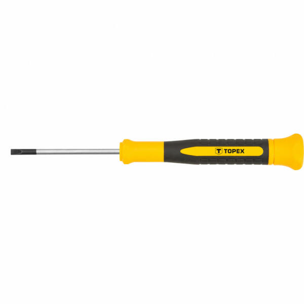 A Topex lapos műszerész csavarhúzó kiválóan beválik szerelési, barkácsolási munkákban. Hegye nagy ellenállóképességű, a szerszámnak hosszú élettartamot biztosító króm-vanádium acélból készült. Az edzett acélból készülő mágneses hegy megkönnyíti a szerszámmal végzett munkát A forgó feltétje funkcionalitását bővíti, lehetővé teszi a szerszám pontosabb v