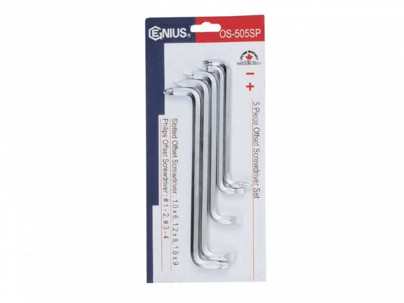 5db kétvégű Z alakú, csavarhúzó készlet 6-lapos szárral. A laposfejű csavarhúzóknál egy száron két egyforma méretű, de 90°-ban elfordított fej található. Laposfejű csavarhúzó; méret: 1x6, 1.2x8, 1.6x9mm Csillagfejű (Ph) csavarhúzó; méret: #1 - #2, #3 - #4 Hosszúság: laposfejű: 125 , 150, 175mm csillagfejű: 125, 175 mm Anyag:High Speed Steel (HSS) - nagy sebességű