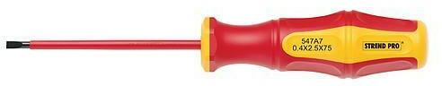 A Strend Pro villanyszerelo csavarhúzó nem hiányozhat a villanyszerelok, valamint a barkácsolók felszerelésébol. Ez egy 1 x 5,5 x 125 mm-es lapos csavarhúzó. A nyél csúszásgátló kezeléssel ellátott muanyagból készült és kényelmes fogást biztosít, felakasztható. Pengéje krómvanádiumból készült és mágnessel rendelkezik. Biztonságos szigetelést biztosít 1000 V-ig t