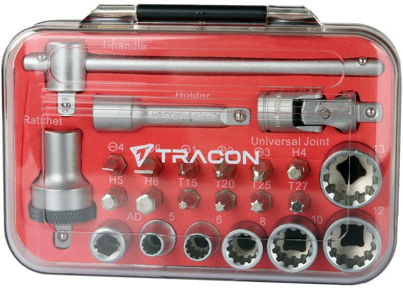 Tracon RK23 Univerzális racsnis T fejes bitkészlet 19 bit PH csillagcsavarhúzók száma: 3 Csavarhúzók száma: 2 Szerszámok száma: 23 Fogantyú anyaga: egyéb Fogantyú kivitel: egyéb Védőszigetelt 1000 V: Nem