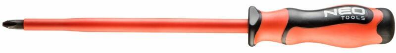 NEO PH kereszt csavarhúzó, 1000 V. A szerszám max. 1000 V feszültség alatti használatra minősített. A csavarhúzó hegye erős S2 acélból készül. A csavarhúzó hegye mágneses. A speciális gallérral ellátott nyél ergonómikus alakja csökkenti a kéz terhelését munka közben. A bimateriál markolat nem csúszik ki a kézből, ellenálló vegyszerek, kenőolajok és zsírok hatá