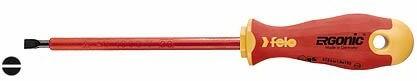 FELO lapos szigetelt csavarhúzó hornyos csavarokhoz, ERGONIC markolattal. Az egyetlen markolat, melynek a belsejében lévő zselés cella alkalmazkodik a felhasználó tenyeréhez, a maximális nyomaték kifejtése mellett, egyedülállóan kényelmessé teszi a munkavégzést. A csavarhúzó 1000 voltig használható. Minden darab 10.000 volttal tesztelt, megfelel az EN60900 szabványnak. Mér