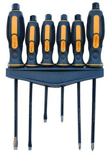 2 db-os extra hosszúságú csavarhúzó készlet. Méretek: 1 db lapos: 6 x 1.6 mm 1 db kereszt: Ph2 Penge hossz: 450 mm (hatszögű) Nyél hossza: 100 mm (kétkomponensű) Teljes hossz: 550 mm Anyag: Chrome Vanadium acél Bruttó súly: 393 g