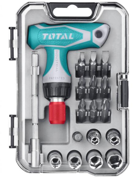 24 db T-nyelű csavarhúzó készlet (TACSD30186) A TOTAL TACSD30186 többcélú csavarhúzókészlet egy univerzális kézi eszköz 24 az 1-ben kivitelben, alkalmas különböző típusú önfékező illesztékek felszerelésére és leszerelésére: SL, PZ, PH, T és H. Tartalmaz egy T-markolatot, mágneses tartót, adaptert csatlakozókhoz, nagyszámú helyet és biteket különböző típusú