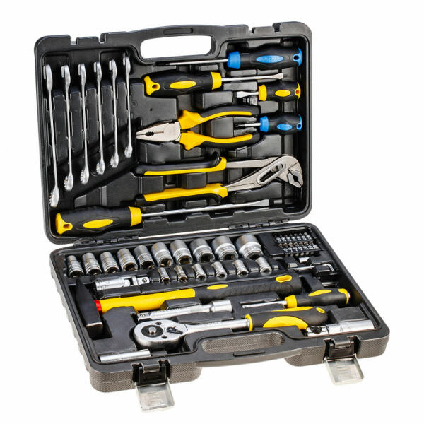 A Topex szerszámkészlet 56 db elrendezett elemet tartalmaz kényelmes műanyag hordtáskában. Minden elemére jellemző a kiváló minőségű kivitel. A készletben olyan alapvető szerszámok kaptak helyet, mint pl. ½"-os racsnis hajtókar, csavarhúzók, fogók, 300 g-os kalapács, csillag-villás kulcsok, dugókulcsok és csavarhúzó bitek. A készlet széleskörű felhasználásra talál