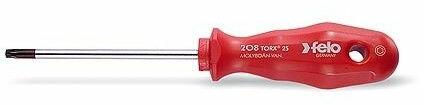 FELO Torx csavarhúzó, különösen nagy igénybevételre tervezett, egy komponensű markolattal. A markolatban található furat segítségével könnyen tárolható a szerszám és egy másik FELO csavarhúzó segítségével extra nyomaték érhető el. Méretei: T9, penge hossza: 60 mm, penge átmérője: 3,5 mm, markolat hossza: 80 mm, markolat legnagyobb átmérője: 25 mm. Penge Anyaga: kr