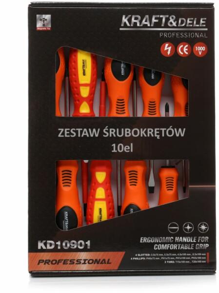 10 darabból álló lapos és csillag csavarhúzó készlet. Ez a készlet alapfelszerelés minden műhely és szerviz számára. A csomagban 2 elszigetelt csavarahúzó is található, 1000 V (1 lapos, 1 csillag). Készlet tartalma: - 4 lapos csavarhúzó (3,0 x 75; 5,5 x 75; 4,0 x 75; 6,5 x 100 mm) - 4 csillag csavarhúzó (PH0x75, PH1x75, PH1x100, PH2x100mm) - 2 TORX csavarhúzó (T15x100, T20x