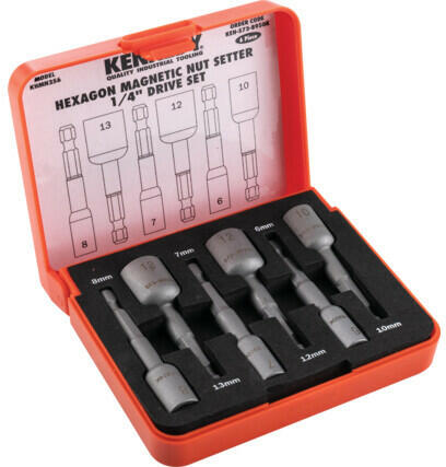 ¼""-os csavarozókészlet 6 darab erősen mágneses, gyorsan cserélhető csavarozófej hatlapú anyákhoz. Hatlapú csavarokhoz és anyákhoz való használatra. Kompatibilis az ütvefúró és ütvecsavarozó gépekkel. Króm-vanádium acélból készült. Erős tartódobozban. A készlet tartalma: 6, 7, 8, 10, 12, 13 mm-es csavarozófej. Megfelel a DIN 3126-as szabványnak és az ISO 1173 szab