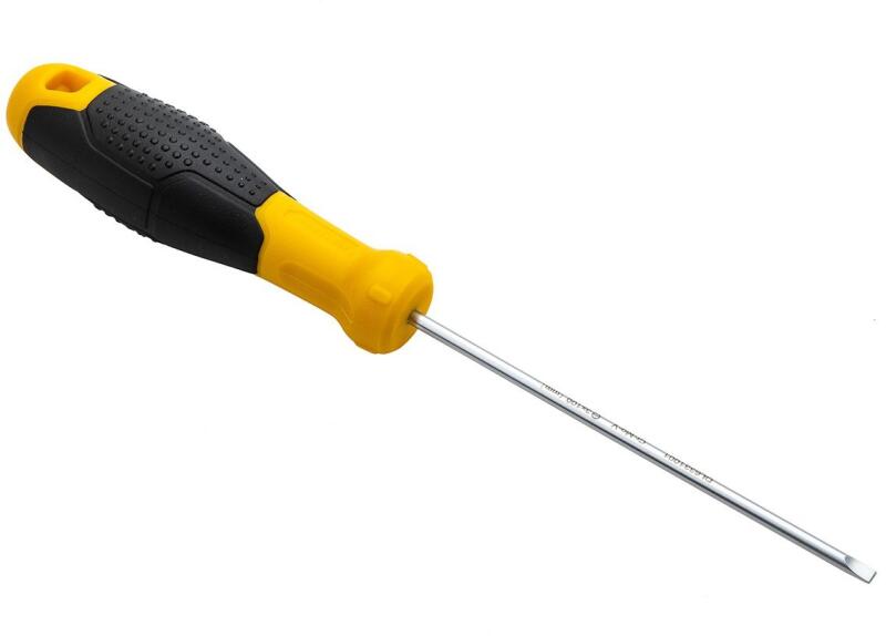 Kényelmesen használható, strapabíró, 3x100 mm -es laposfejű csavarhúzó sárga színben. A termék fogantyúja kiváló minőségű műanyagból készült. Praktikus lyukkal rendelkezik, amely lehetővé teszi a szerszám felakasztását, például egy szerszámtáblára. A csavarhúzó mágneses csúccsal is fel van szerelve, ami nagyban megkönnyíti a munkáját. Méret: 3x100mm Anyag: C