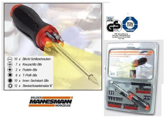JELLEMZŐK: 1 év garancia, TÜV/GS minősítésű termék a 80 éves legendás német MANNESMANN WERKEZEUGE-től. Különleges, utolsó bemutató darab ez a készlet. 2db beépített led világítás a munkaterület megvilágítására. A lámpa 2db 1.5V-os AAA-s elemmel működik. Tartozékok:1db 235mm-es flexibilis szárBitek T10-től T40-igPh0, Ph1, Ph2, Ph3Hatszögbitek 2-6mm és 3/32-1/4Lapo