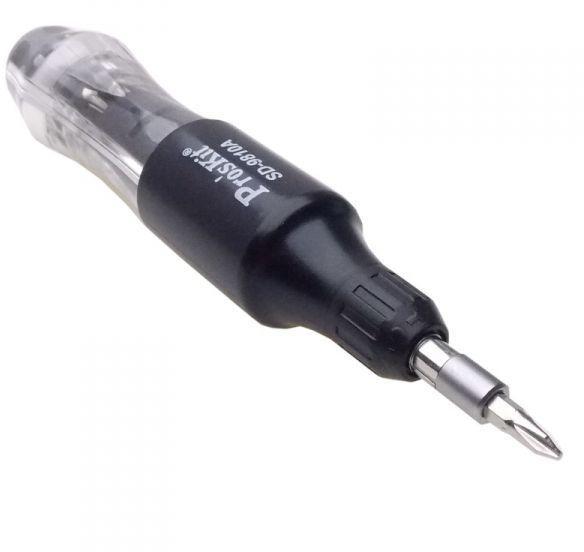 Precíziós csavarhuzó 3 állású racsnis befogóval a hatékony munkavégzéshez. Forgatható tár 6db betét tárolására és gyors cseréjére. 10db kiváló minöségű króm-molibdén vandiun ötvözetű acél csavarhuzó betét. Kereszt fej: Ph 00,0, 1 Lapos fej :1.5, 2.0, 3.0 mm Torx fej :T5, T6, T8, T10 Származási hely: Taiwan