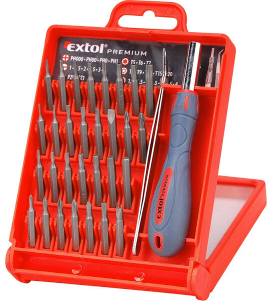 EXTOL® PRÉMIUM Órás csavarhúzó készlet 32db, cserélhető Chrome Vanadium Bitekkel (8819105) Termék tualjdonságok: - Ergonómikus, percíziós markolattal ellátva - Felállítható műanyag tartó dobozban - 115 mm, mágneses szárral - Mini CrV BIT -ek (Acél keménység: HRC 55-58) - 5 év garancia A csomag tartalma - Lapos bit (6db): 1mm, 1,5mm, 2mm, 2,5mm, 3mm, 4mm - Csillag bit PH (