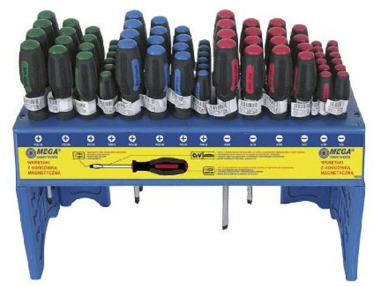 Bemutató tartó, 126 darab mágneses hegyű, króm-vanádium acél ötvözetű csavarhúzó, gumírozott, csúszásmentes fogantyúval Tartalmaz: - lapos csavarhúzók: 3x75 12 db, 4x100 8 db, 5x75 8 db, 6x100 8 db, 6x150 10 db, 8x200 8 db - csillagcsavarhúzók: (PH): PH0x75 12 db, PH1x75 8 db, PH2x100 10 db, PH3x150 8 db - pozidriv csavarhúzók: (PZ): PZ0x75 8 db, PZ1x75 8 db, PZ2x100 10 db, P