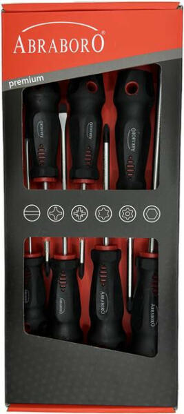 Csavarhúzó készlet 7 részes ABRABORO T1 black line ABRABORO 7 részes csavarhúzó készlet Tartalma: 3,0 x 100 | 4,0 x 100 | 5,5 x 125 | 6,5 x 150 PH 1 x 80 | PH 2 x 100 PZ 2 x 100