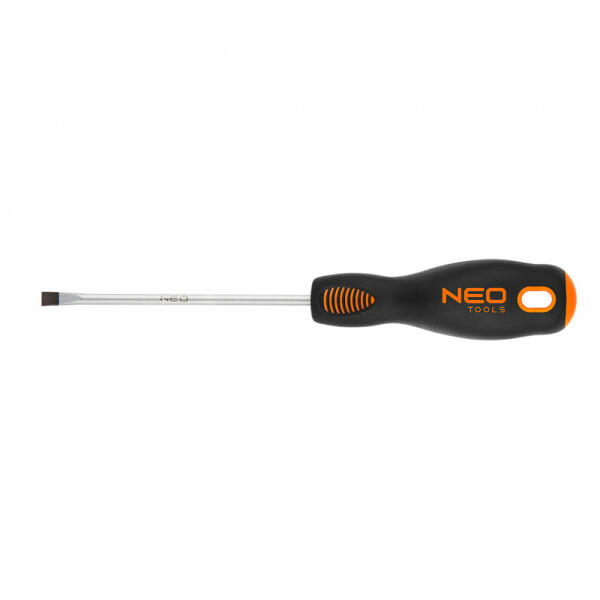 Neo lapos csavarhúzó. A csavarhúzó szára kivételesen ellenálló S2. A csavarhúzó hegy hőkezelésnek lett alávetve, így megfelelő, 56 HRC keménységet és hajlítószilárdságot ért el. A csavarhúzó hegye mágneses. A markolat három élű hasáb alakja a kialakított hüvelyktámasszal csökkenti a kéz megterhelését munka közben, és megkönnyíti a megfelelő forgatónyomat