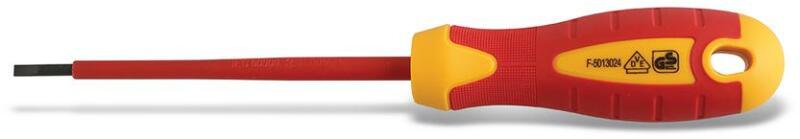 HÖGERT Csavarhúzó szigetelt 1000V, lapos, 4 x 100 mm, acél S2, mágneses (HT1S904) Termék információ: Ház anyaga: S2 acél Méret: 4 x 100 mm Feszültség alatt történő munkálatokhoz engedélyeztetett 1000V lapos csavarhúzó Erőteljes csavarozáshoz alkalmas Két oldalt polírozott csavarozó fejek, összetartó és párhuzamos profilozással A EN 60900 szabvány szerint gyártott VD