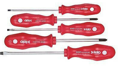 FELO csavarhúzó készlet, különösen nagy igénybevételre tervezett, egy komponensű markolattal. A markolatban található furat segítségével könnyen tárolható a szerszám és egy másik FELO csavarhúzó segítségével extra nyomaték érhető el. Tartalma: 3,5x100, 4,0x100, 5,5x125, PH1x80, PH2x100. Penge Anyaga: króm-molibdén-vanádium acél ötvözet. Felületkezelés: krómozot