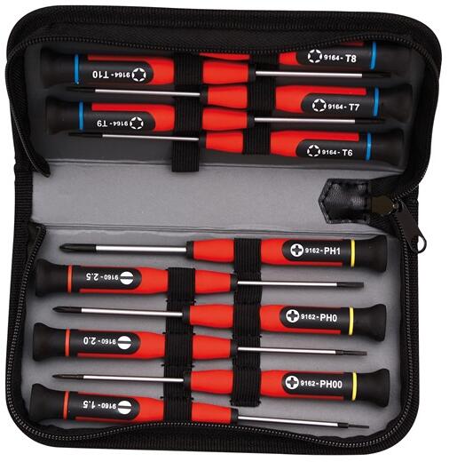 MOB csavarhúzó készlet műszerész 6 részes textil tartóban 9169010001 A készlet tartalma: Lapos csavarhúzók: 2 x 0,4/2,5 x 0,4/3 x 0,5 Phillips csavarhúzók: PH00/PH0/PH1