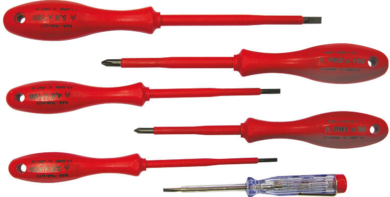 Keménység 58 +/- 2 HRC Műanyagdobozba csomagolva A 10078 készlet tartalmaz: - lapos csavarhúzók: 3x100, 4x100, 5.5x125 mm - pozidriv csavarhúzók: (PZ): 1x80, 2x100 mm - fázisceruza: 125-250 V, 140 mm A 10079 készlet tartalmaz: - lapos csavarhúzók: 3x100, 4x100, 5.5x125 mm - csillagcsavarhúzók: (PH): 1x80, 2x100 mm - fázisceruza: 125-250 V, 140 mm